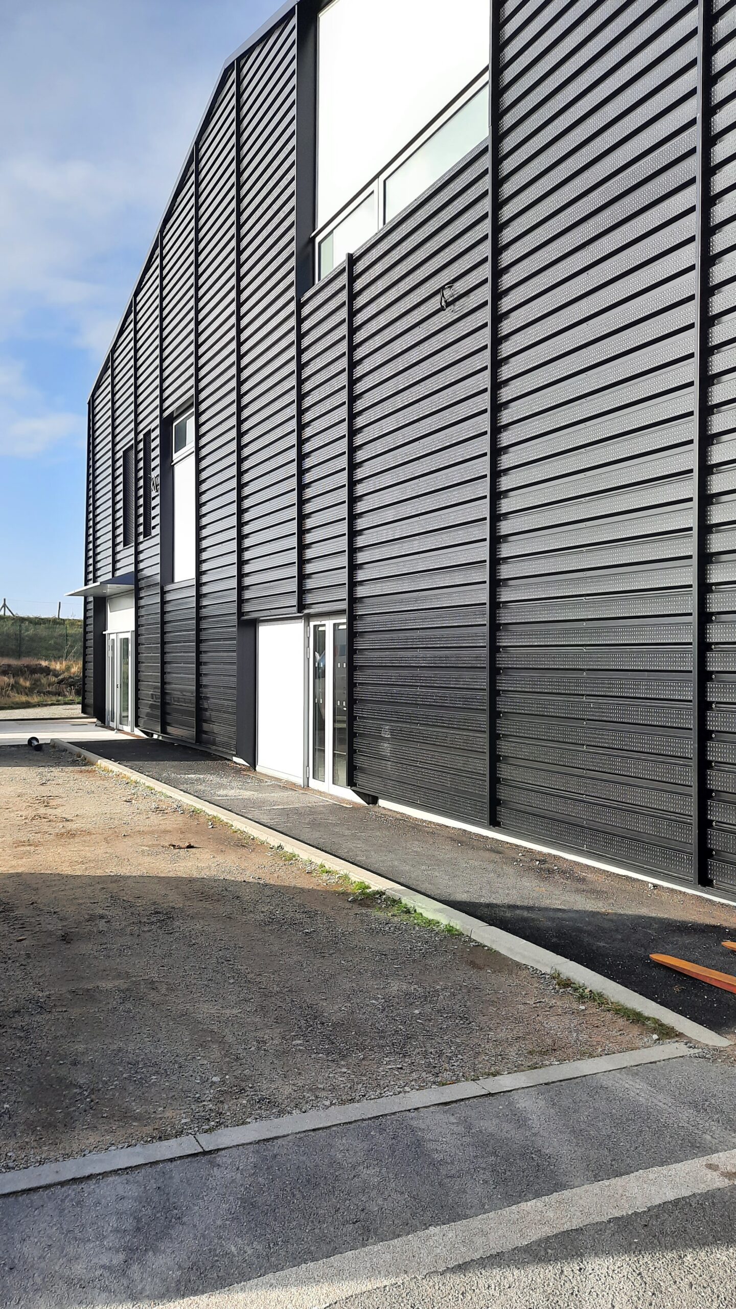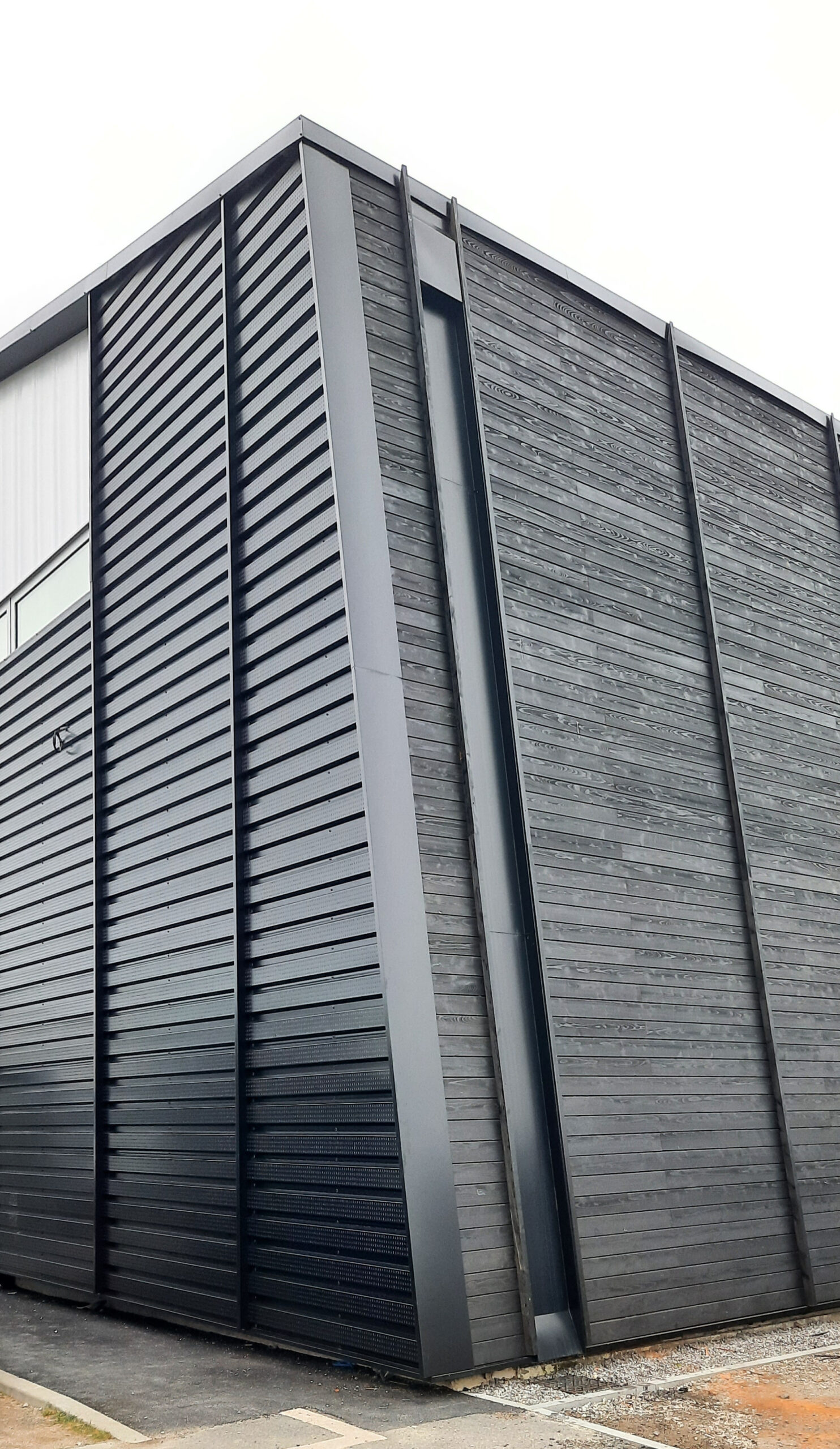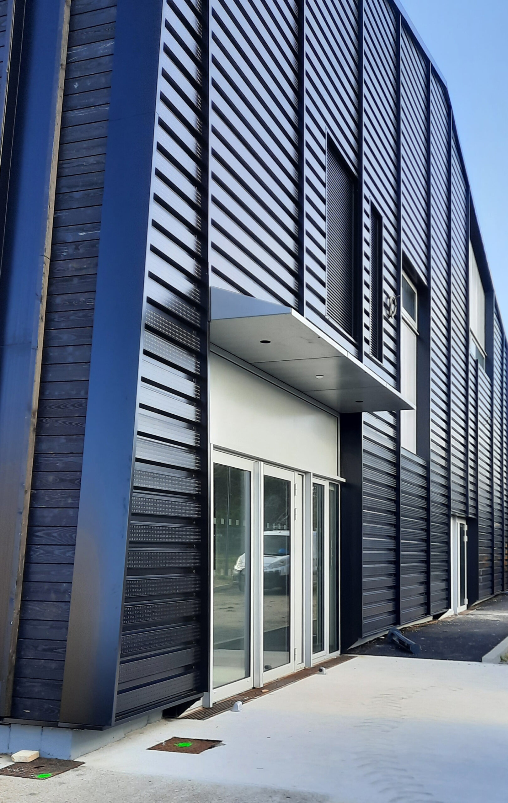 – ses façades, noires et horizontales, épousent la tradition des salorges : bardage bois pour les pignons, mur solaire au sud, et jeu de transparences (vitrages, bandeaux translucides) pour capter la lumière.