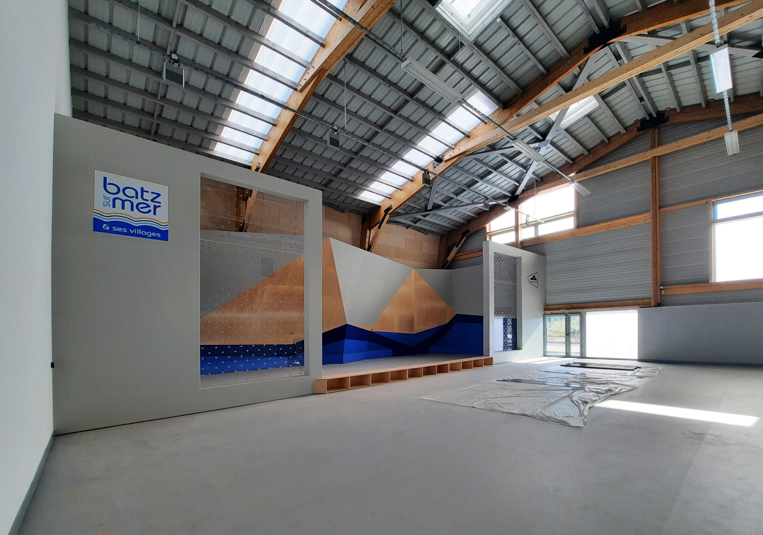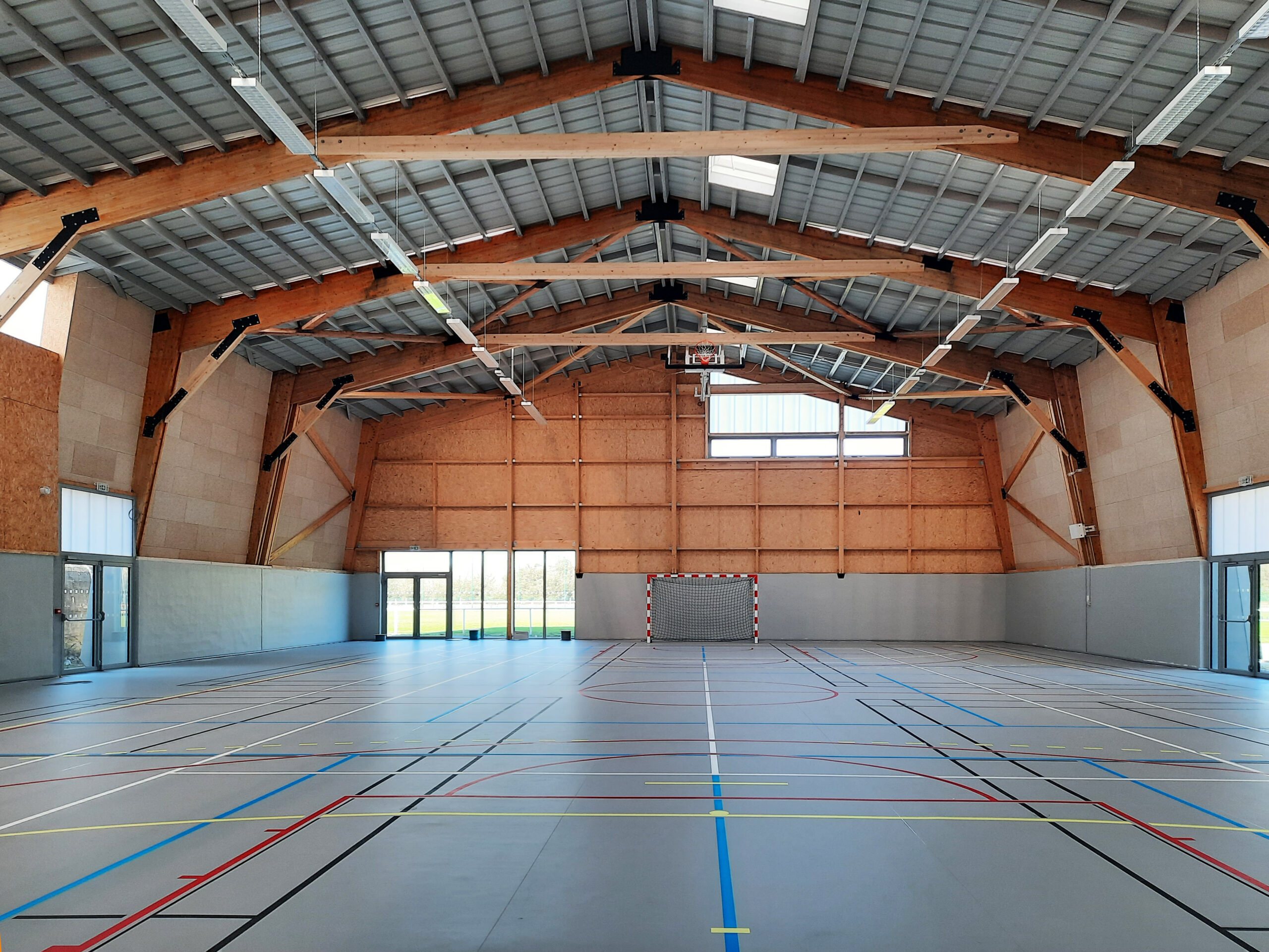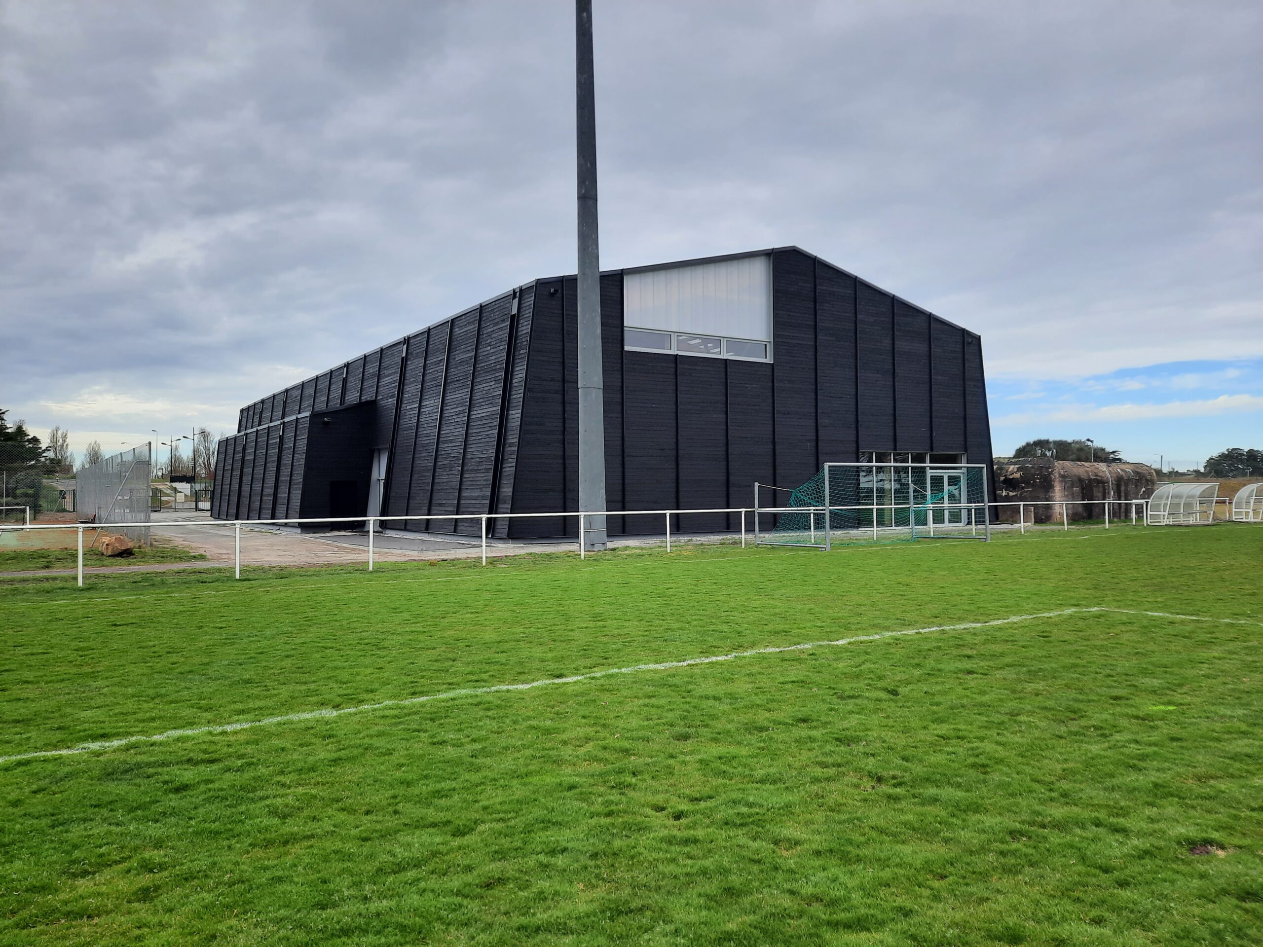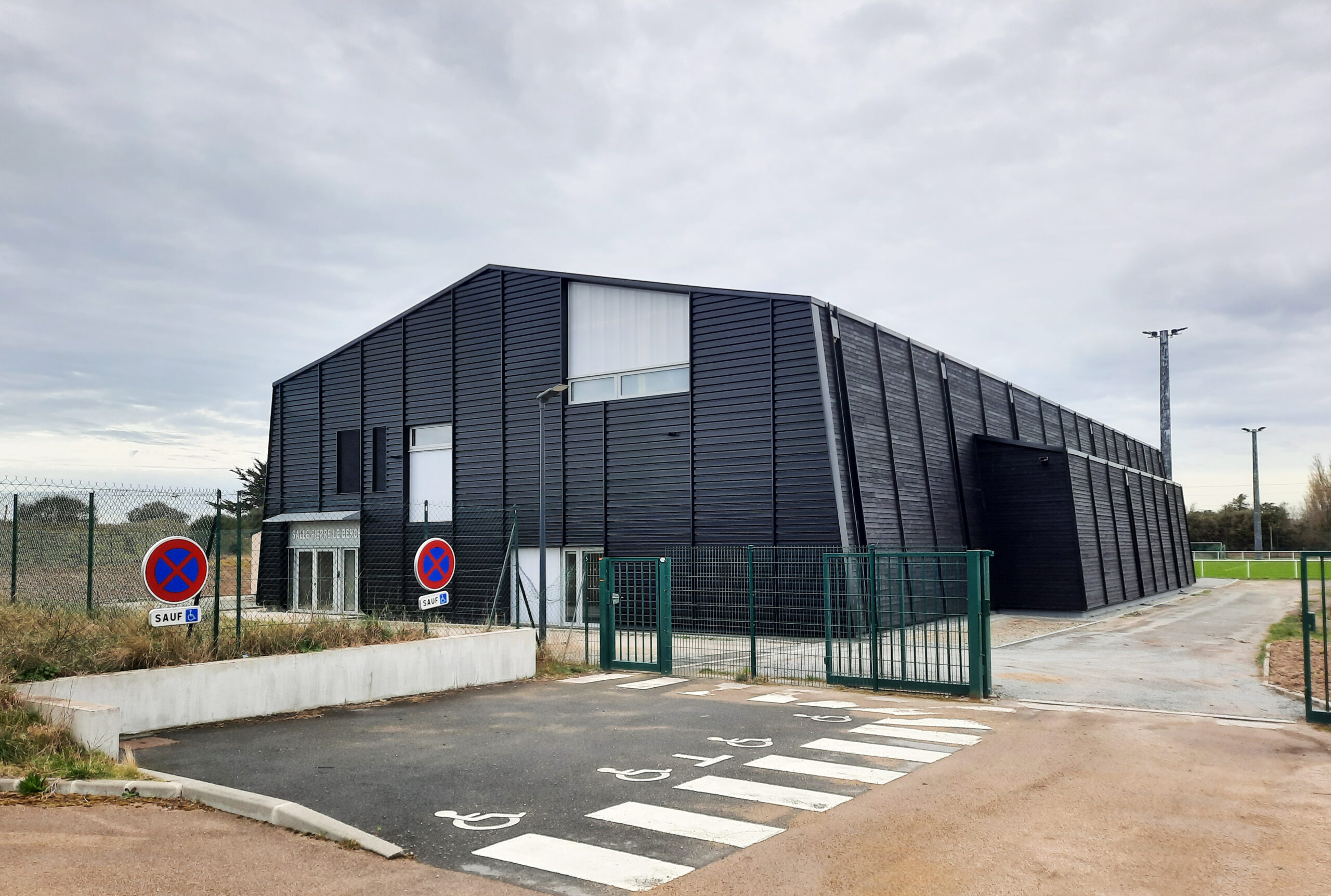 Au cœur d’un site sauvage et sportif, coincé entre le murmure des rails et le souffle de la mer, la salle des sports de Batz-sur-Mer se dresse, héritière des salorges, ces abris de sel qui ont façonné le paysage. Autour d’elle, des terrains de football, une buvette et un blockhaus silencieux. La végétation, frugale et libre, évoque les landes et les marais voisins.