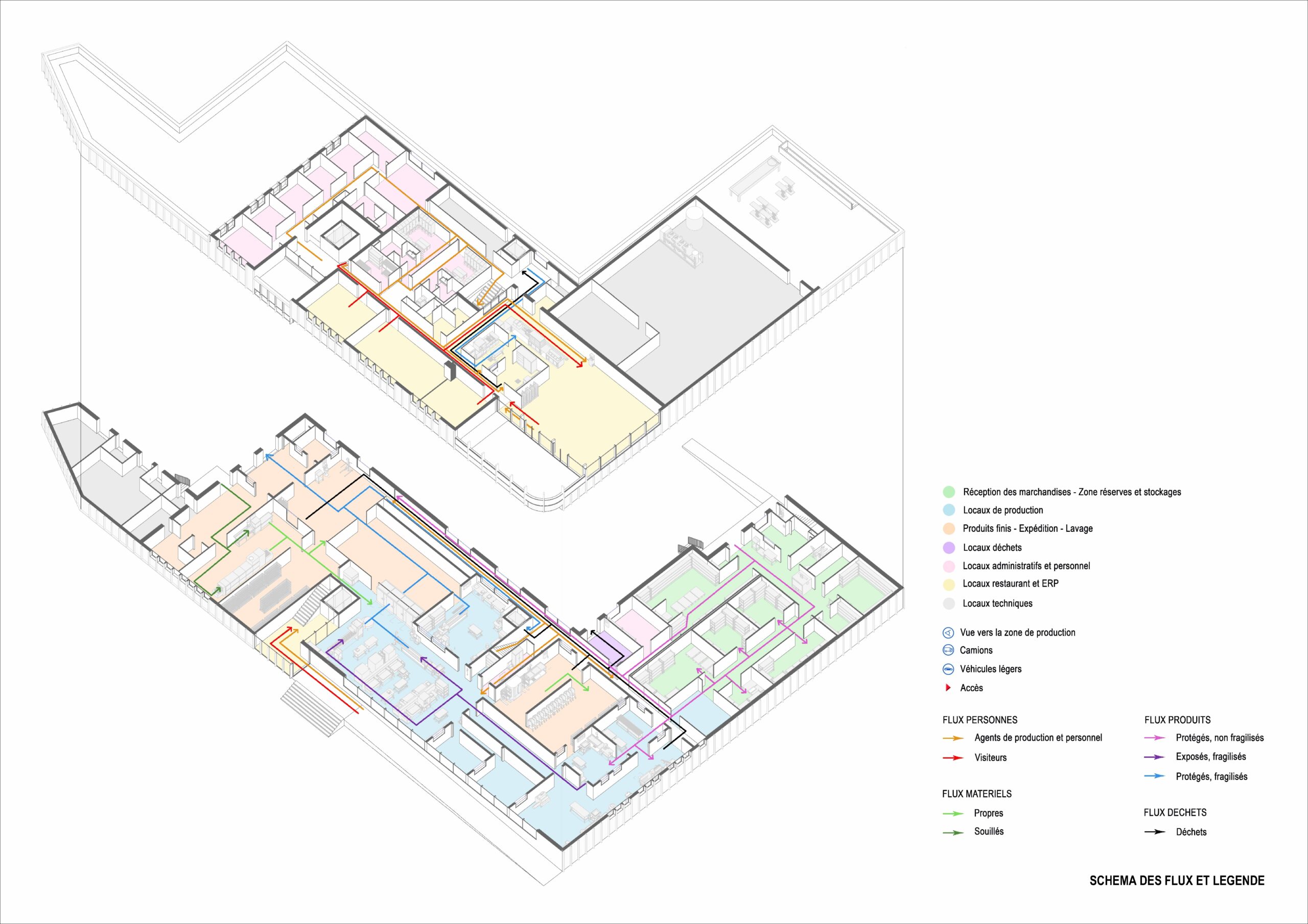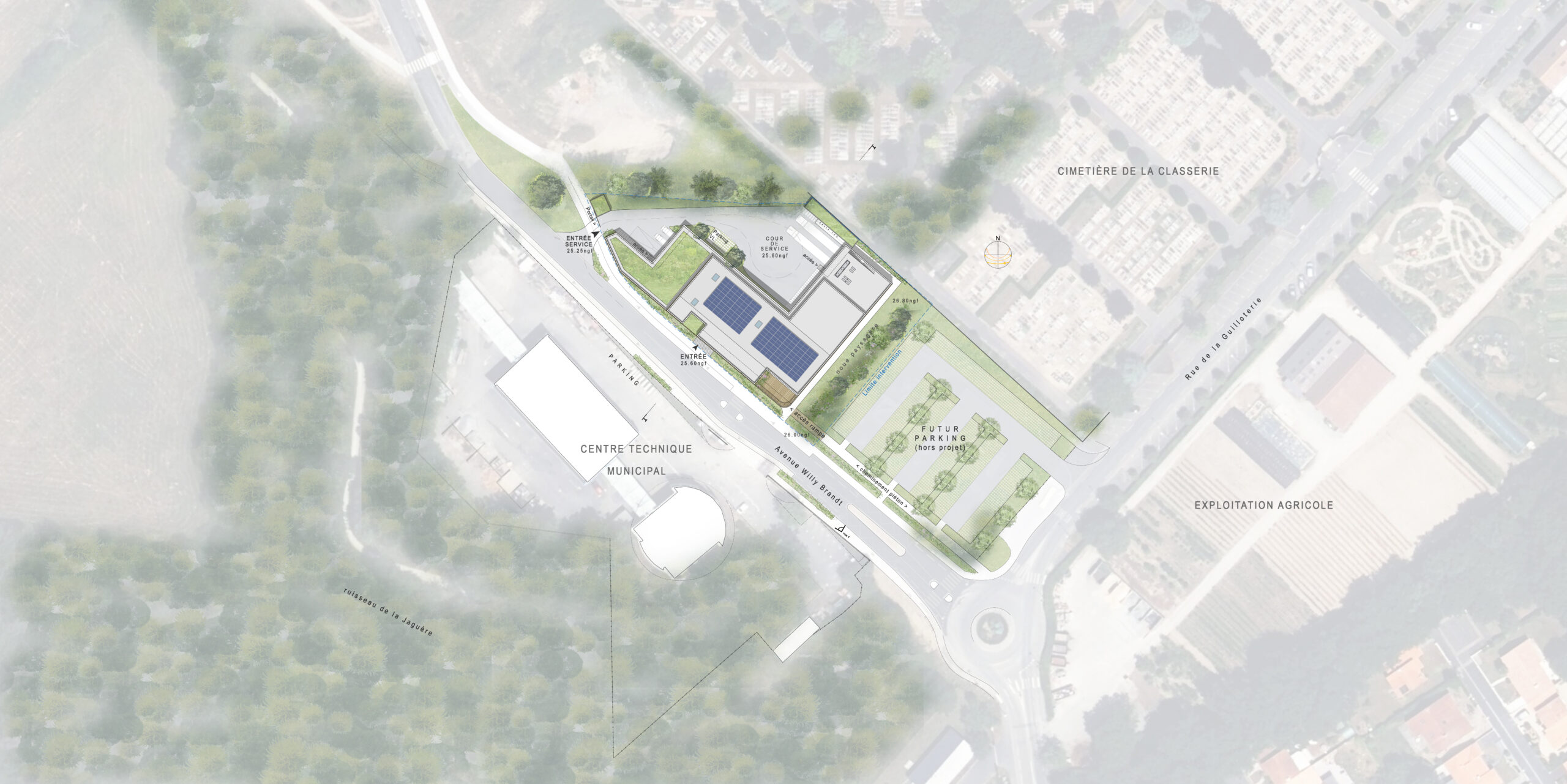 Nous avons cherché à réduire au strict minimum l’imperméabilisation des sols, en travaillant une forte compacité de l’ensemble, avec un bâtiment sur 2 niveaux et une cour de service optimisée et à la juste échelle, et ainsi libérer au maximum les espaces au sol périphériques au bâtiment qui seront largement plantés et accompagnés d’une noue végétalisée et arborée. Une vraie gestion des eaux pluviales est ainsi intégrée au sein de la parcelle, en continuité de la haie bocagère existante au Nord-Ouest du site.